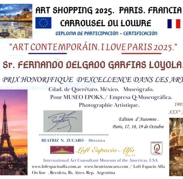 Gallería "La Pigna" Roma, Italia. Abril 2024 logrando salir vencedor y premiado con el pase expositivo en la Bienal de Arte Contemporáneo de Roma en su edición XV junio 2024.